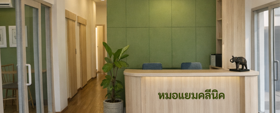 ในด้านบรรยากาศ Dr. Yam ต้องการโทนสีเขียวผสมผสานกับวัสดุไม้ธรรมชาติ เพื่อสร้างความรู้สึกอบอุ่น สงบ และเป็นมิตรต่อผู้มาใช้บริการ