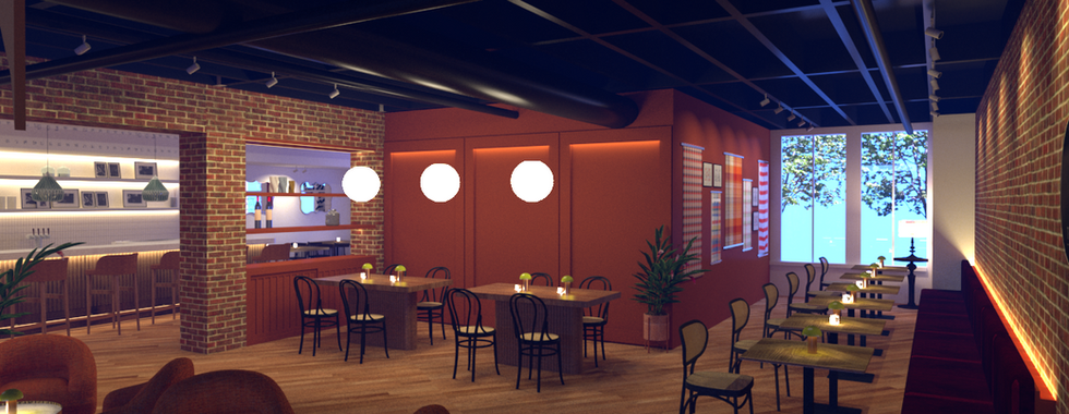 แนวทางของเจ้าของร้านเน้นโทนสีส้มอบอุ่น ผสมผสานกับเฟอร์นิเจอร์สไตล์ Mid-Century Modern ตัวอาคารตั้งอยู่ในย่านประวัติศาสตร์ของ Roswell ซึ่งในอดีตเคยเป็นศูนย์กลางอุตสาหกรรมสิ่งทอ และปัจจุบันพัฒนาเป็นย่านที่อยู่อาศัยคุณภาพสูง